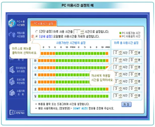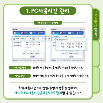 이 프로그램은 PC 사용 시간 제한은 물론이고 유해 사이트 차단, 게임 사용 시간 제한, 인터넷 사용 시간 제한 등 다양한 기능을 제공합니다.