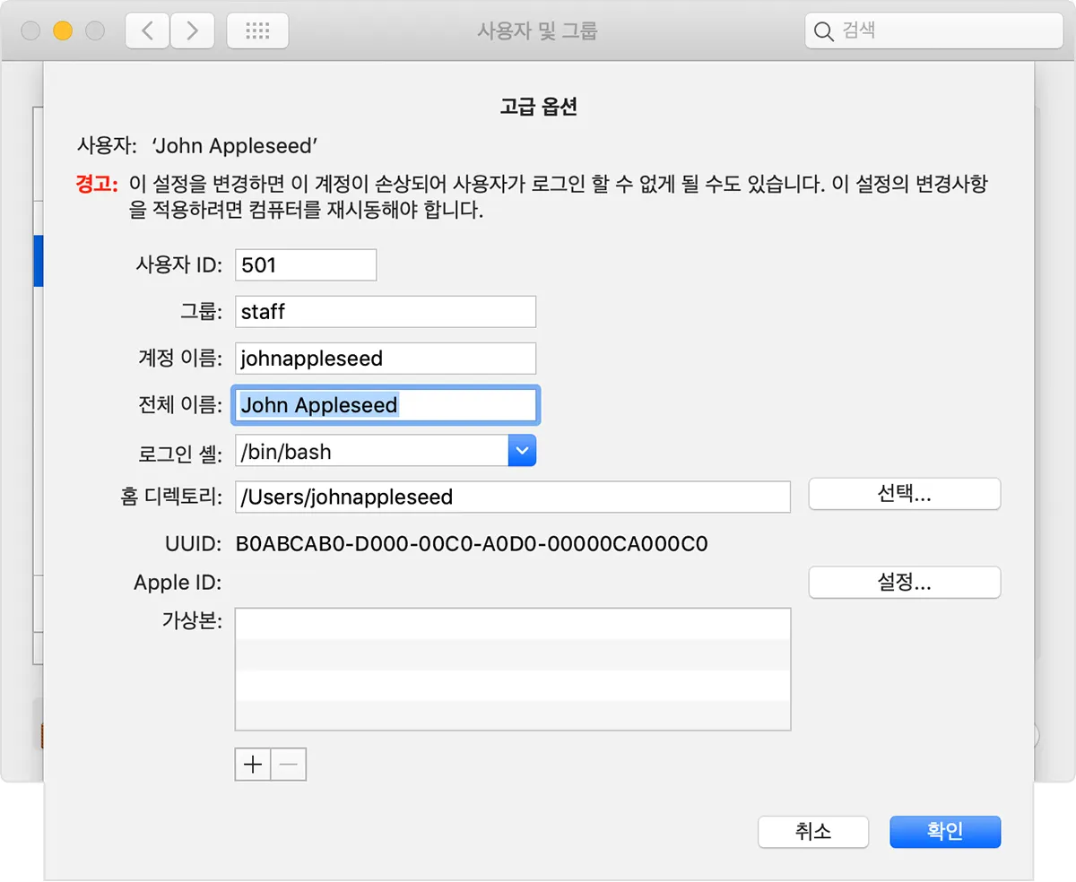 맥에서는 시스템 환경설정 → 사용자 및 그룹에서 아주 간단하게 계정 이름을 바꿀 수 있거든요.