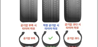 공기압이 낮으면 타이어 양쪽 가장자리가 빨리 닳아요. 반대로 높으면 중앙 부분만 집중적으로 마모됩니다. 균일하게 닳아야 오래 쓸 수 있는데, 공기압 불균형은 편마모의 주범이에요.
