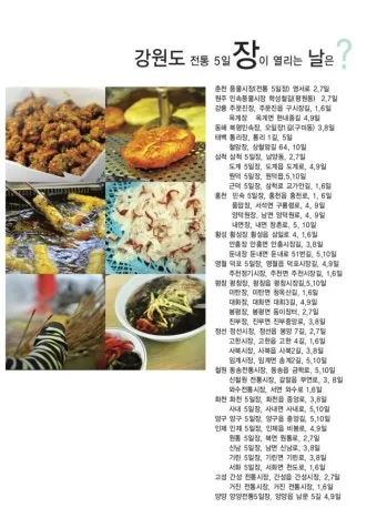 지금부터 강원도 5일장 날짜, 일정표, 화천, 삼척, 영월덕포, 봉평, 정선, 음식 추천, 강정에 대한 내용을 아래에서 확인해 보도록 하겠습니다.