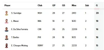 3위는 내슈빌 SC의 샘 서리지가 차지했는데, 24골로 부앙가와 동률이지만 도움에서 밀려 3위에 랭크되었습니다.