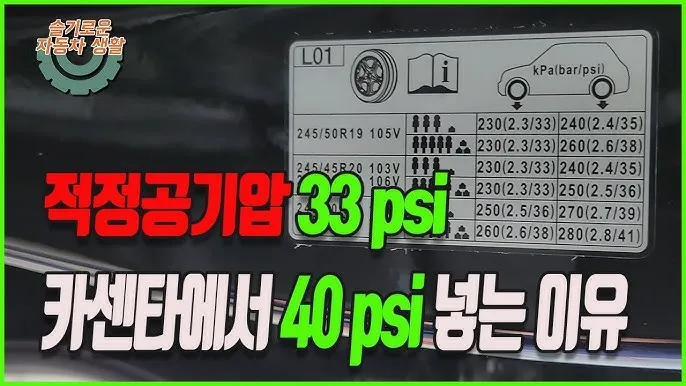 제 경험상 겨울철 스키장 갈 때나 여름휴가 때 짐 가득 싣고 가면 타이어가 좀 처지는 느낌 있잖아요? 그럴 땐 3~5 PSI 정도 더 넣어주면 주행이 훨씬 안정적이에요.